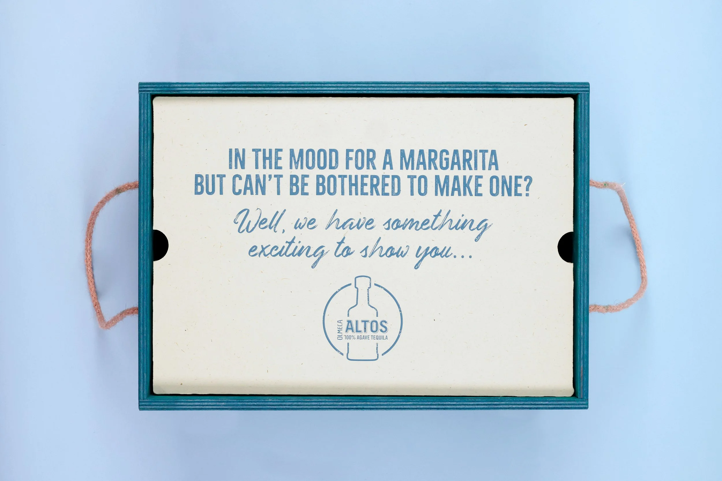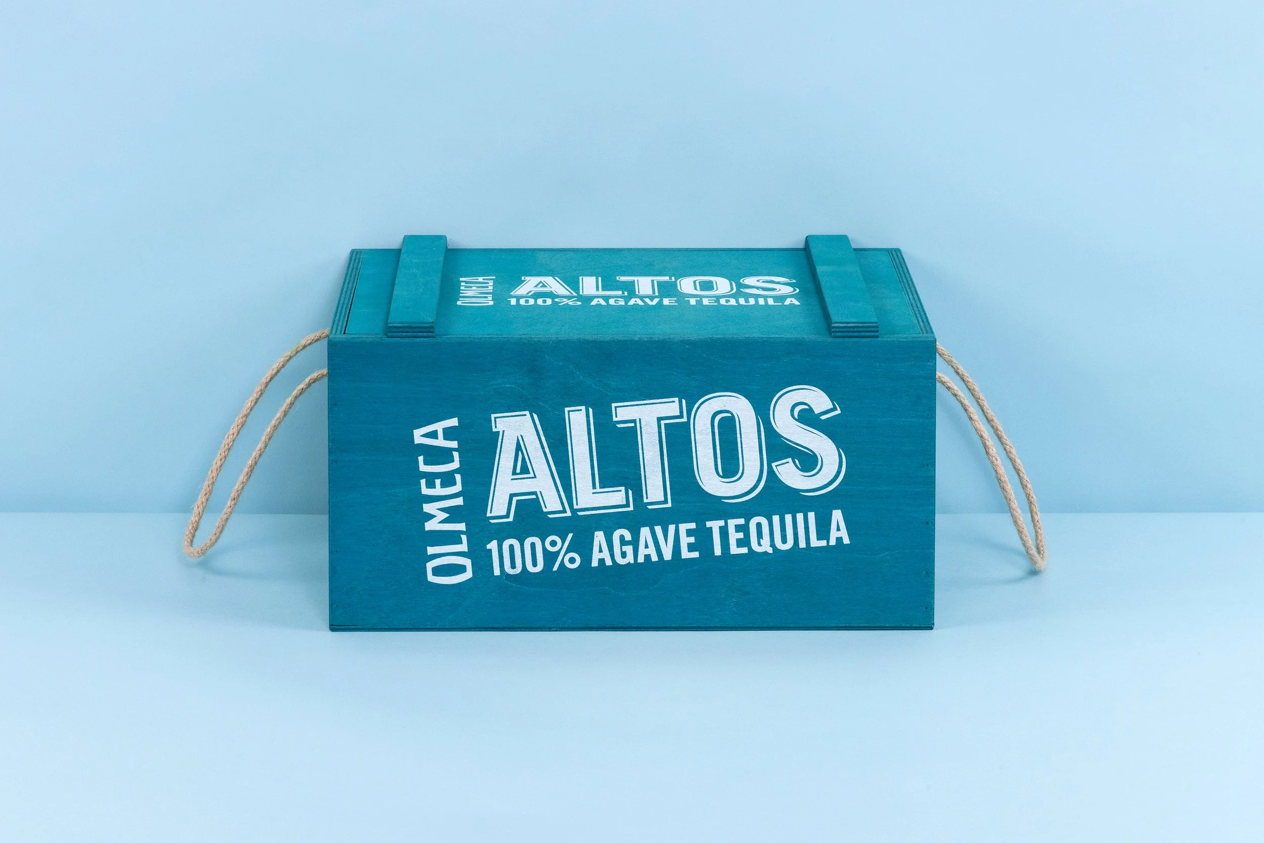 Custom wooden crates created to celebrate the launch of Altos Ready to Serve, a refreshing pre-mixed Margarita made with 100% agave tequila. Each crate was finished in Altos' signature blue, featuring screen-printed branding and rope handles, and packed with a bottle of Margarita, branded glasses, ceramic coasters, a burlap bag, and a sprinkle of Tajín seasoning.